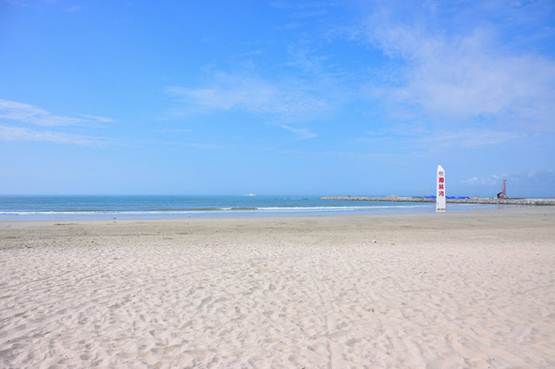 高隆的沙滩沙质很细、沙面几乎与大海处于同一水平线了,谁要把沙染成蓝色,就分不清哪是沙滩哪是海了,上午来这里的人还比较少,很安静